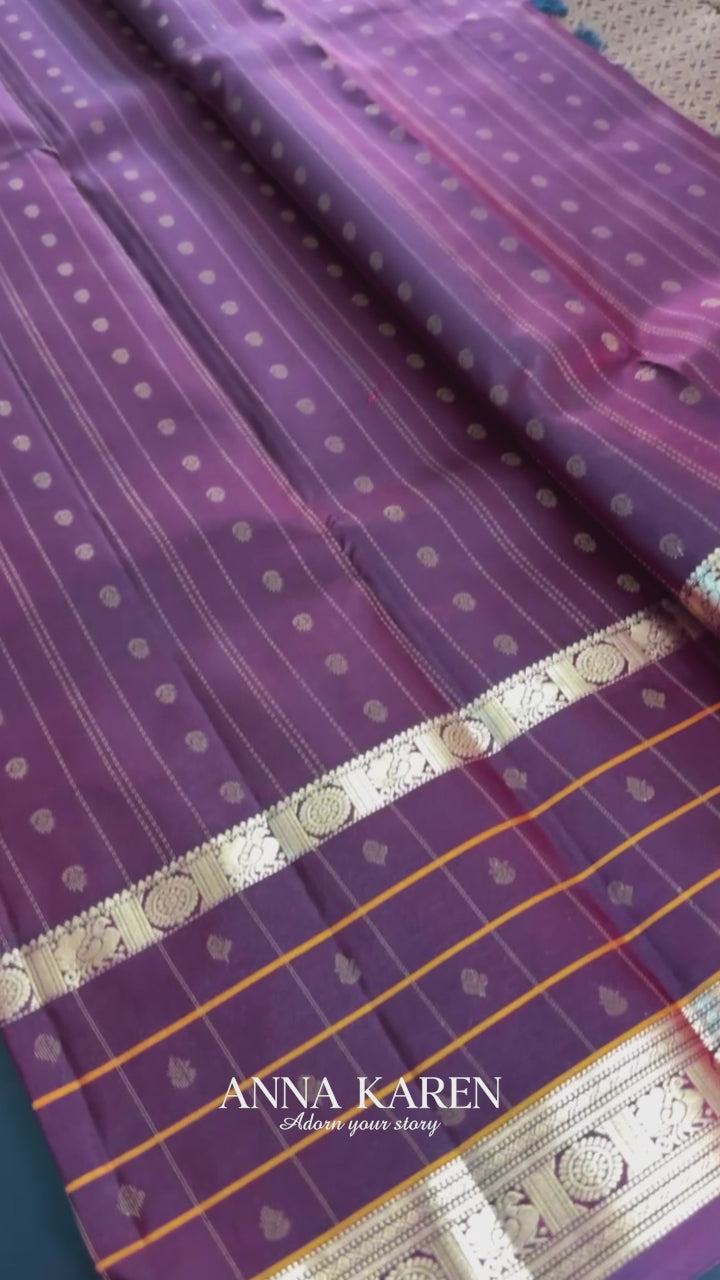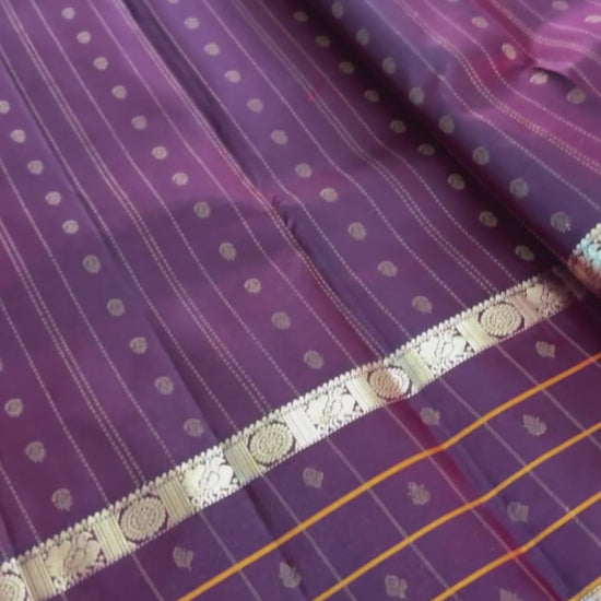 Immerse yourself in the timeless beauty of this Arakku red Pure Kanchipuram Silk Saree, woven with golden zari stripes and delicate buttas across the body. The rich wine-red hue paired with intricate zari detailing radiates grace and opulence, making it a perfect drape for weddings and festive occasions.