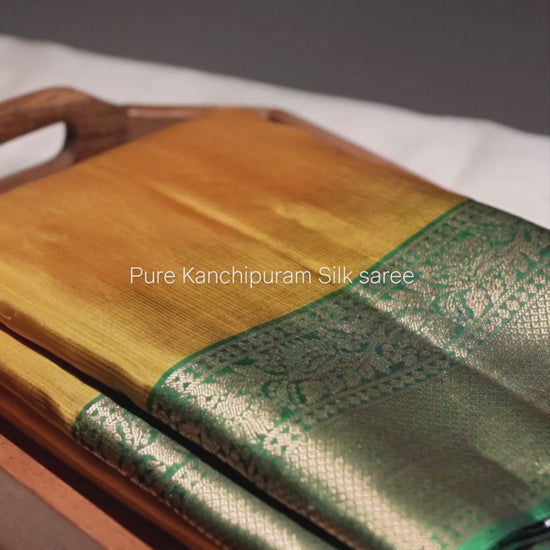Indulge in timeless elegance with our Yellow–Green Kanjivaram Silk Saree, a perfect blend of tradition and sophistication. The vibrant golden-yellow body beautifully complements the rich emerald green border and pallu, adorned with intricate zari weaving that adds a regal charm.